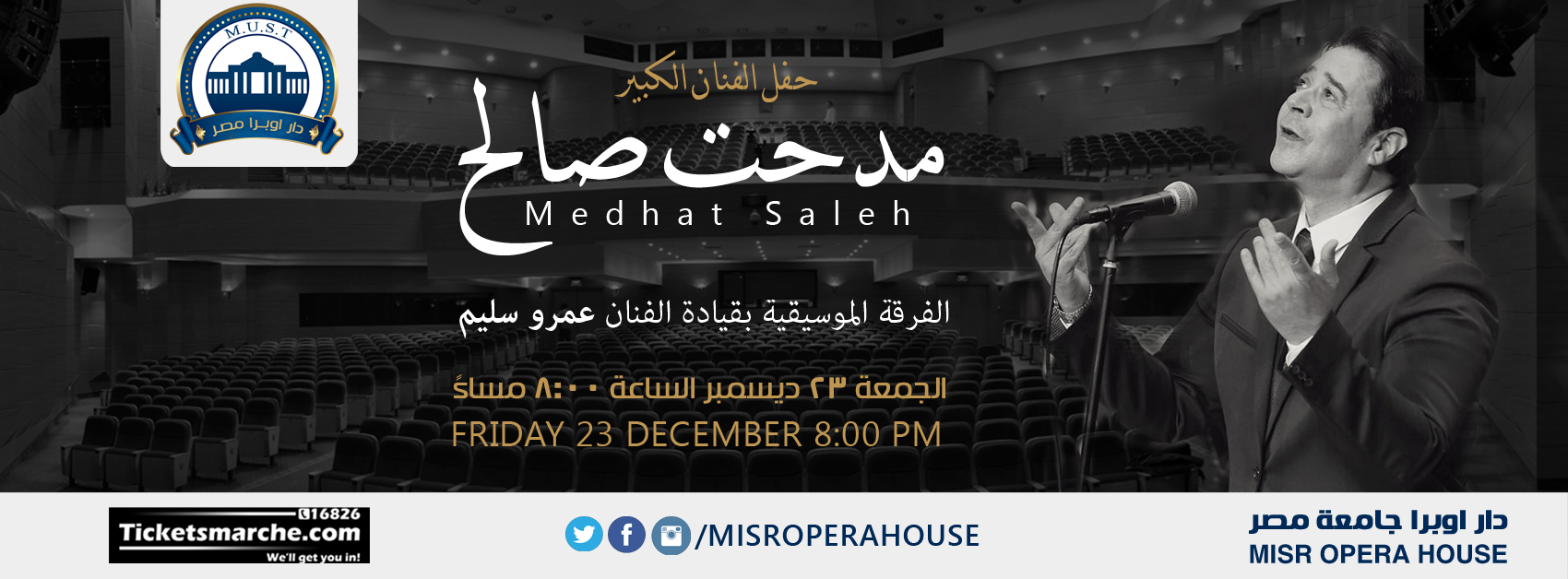 حفل موسيقي عربية مع الفنان الكبير مدحت صالح والفرقة الموسيقية بقيادة الفنان عمرو سليم الجمعة 23 ديسمبر 2016 الساعة 8:00 مساءً.