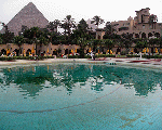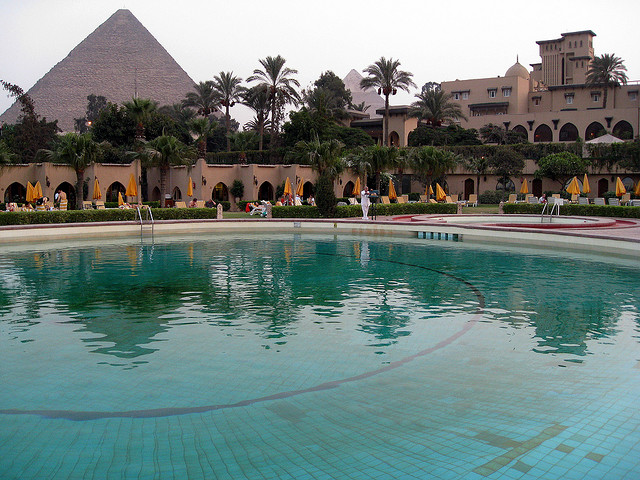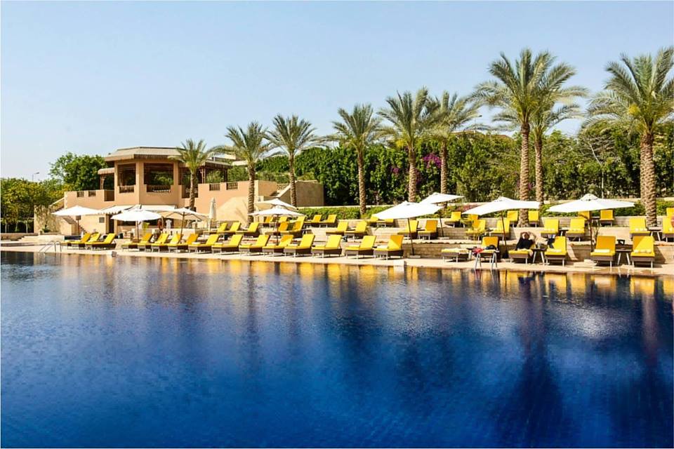 حمام سباحة دائري جميل مساحته كبيرة وفيه غرف كثيرة لمحبي السباحة، وطبعًا مش هـ ينفع ننسى المنظر المهيب لأهرامات الجيزة، وميزة تقضية يوم في مينا هاوس هي الإطلالة الرائعة