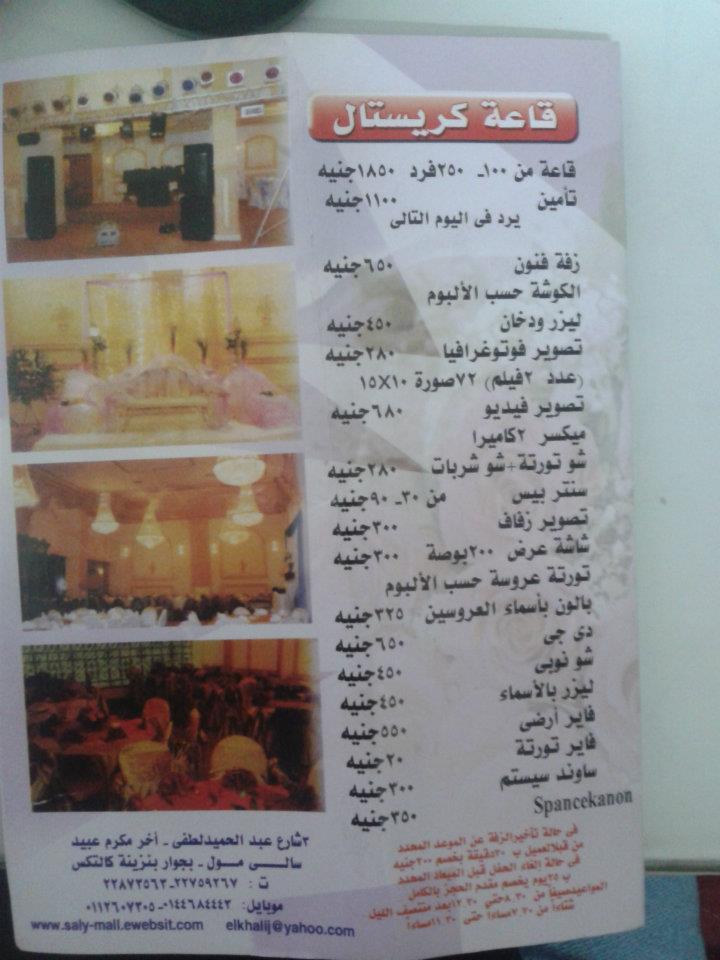 ندعوكم لعقد الزفاف في أجواء أسطورية في واحدة من القاعات الأكثر تقدما قاعة كريستال - سالي مول في القاهرة, قاعة فاخرة حيث يتم الجمع بين الأناقة والخدمة الممتازة. تصميم الديكور يعتمد على مزيج من الالوان الراقية. هذه القاعة جميلة جدا ومجهزة تجهيزا كاملا . .